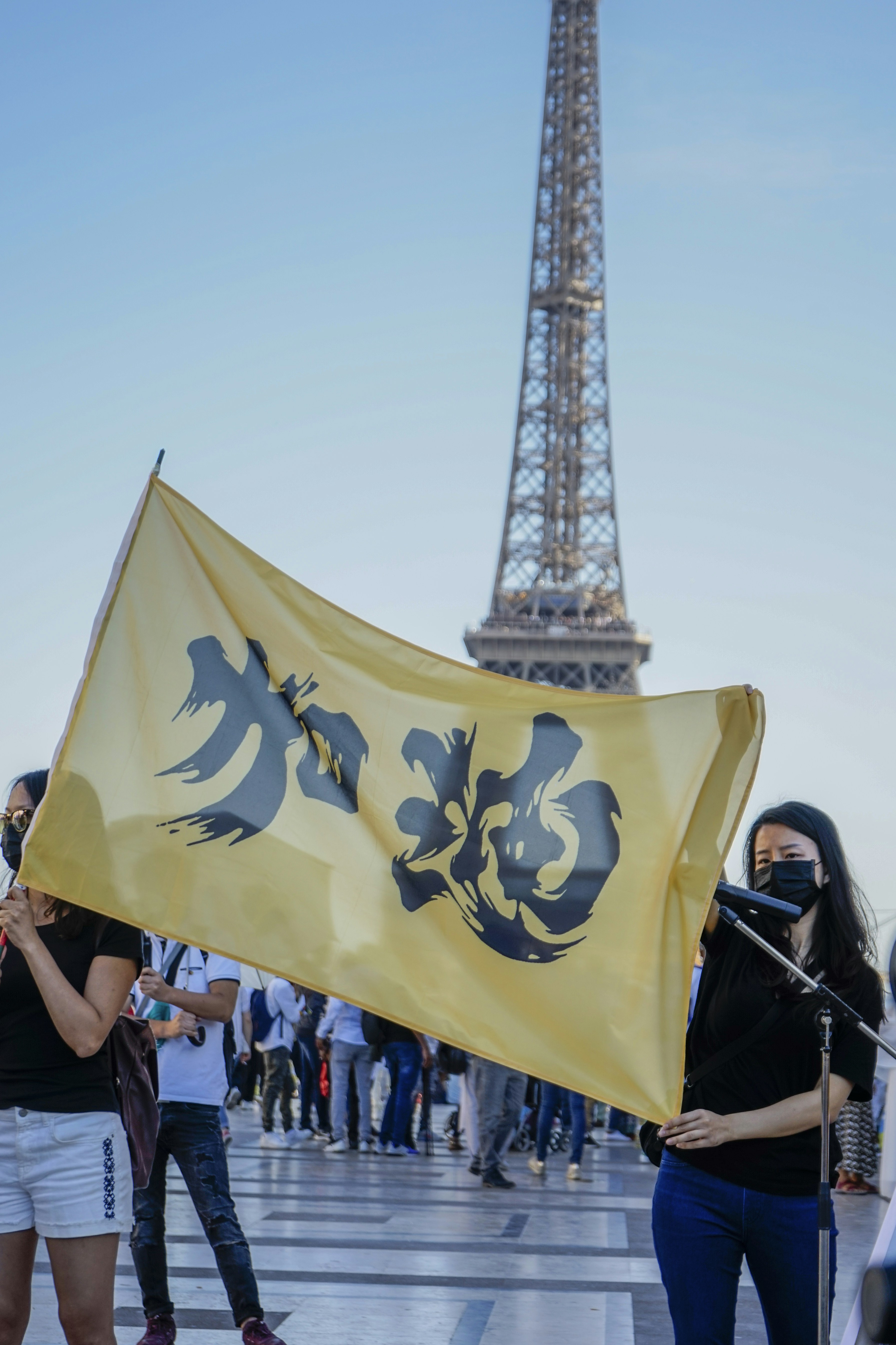 Two Women Holding Yellow Flag With Kanji Script Photo Free Human
